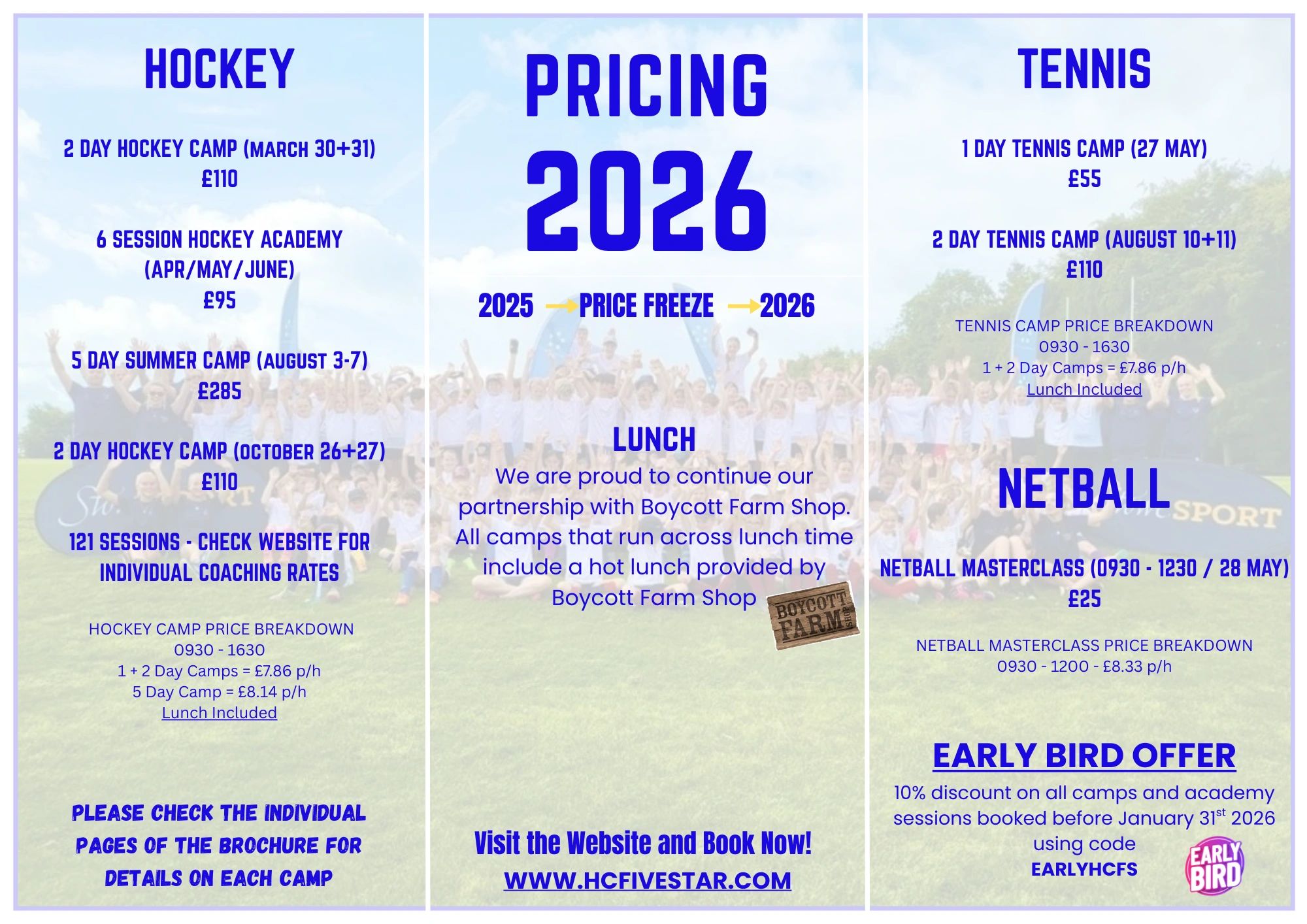 For the second year running, we are freezing our prices on all 2 and 5 day Hockey Camps. We are also price matching our new Tennis Academy Camps to fall in line with our hockey offer.